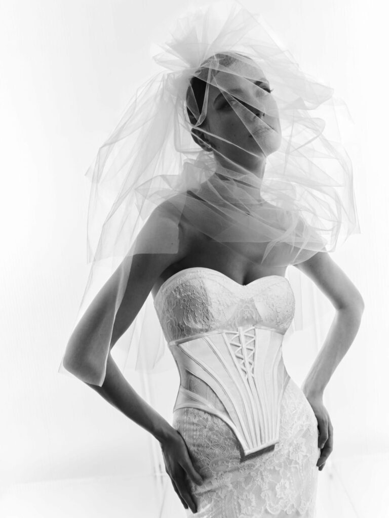 Ciò che distingue il progetto è la volontà di fondere forza e delicatezza: ogni abito è concepito come un oggetto d’arte che accompagna la sposa nella sua esperienza personale, ma che parla anche di eleganza come atto progettuale.