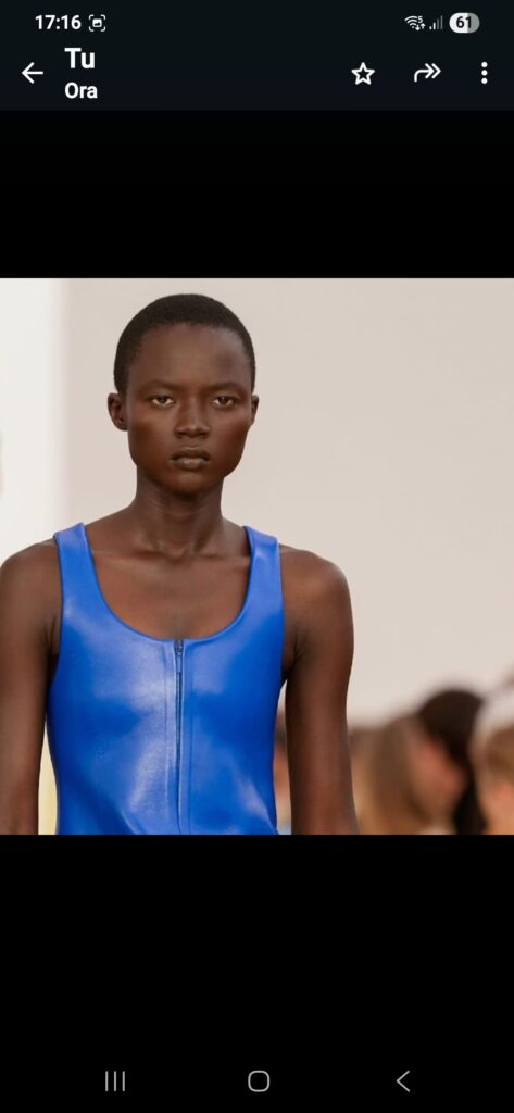 - Giustapposizioni sporty-luxury: felpe annodate sulle spalle, capi in denim trattato, parka e bomber convivono con minigonne asimmetriche e dettagli sartoriali di livello alto.