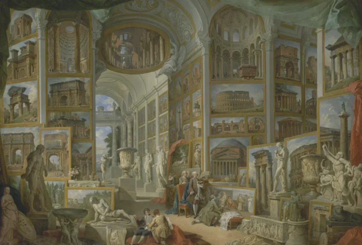 Il fulcro della mostra è rappresentato da “Roma Antica” di Giovanni Paolo Panini (1757), grande capolavoro del vedutismo settecentesco, in cui la città eterna viene ricostruita come teatro ideale della memoria classica. Un’opera che sintetizza perfettamente lo spirito del Grand Tour: osservare, studiare, collezionare e trasformare l’esperienza del viaggio in conoscenza.