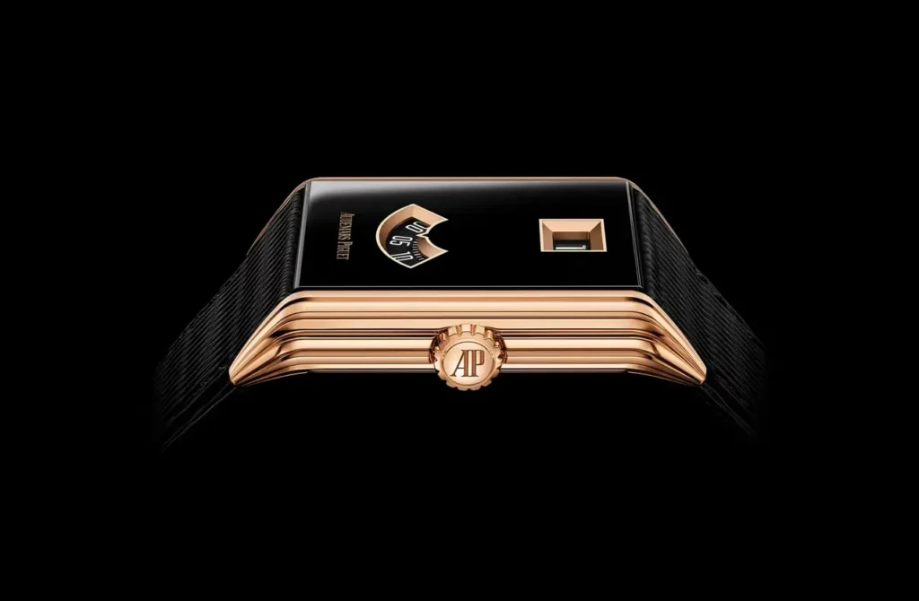 Al polso la proposta punta sulla compattezza visiva: il cinturino in vitello nero testurizzato è integrato tra le anse e amplifica l’effetto “blocco” monolitico, perfettamente coerente con il quadrante scuro. La fibbia ad ardiglione in oro rosa 18 carati, firmata AP, conferma l’impronta elegante del modello. Non è presente alcuna luminescenza: la leggibilità si basa esclusivamente sul contrasto e sulla pulizia grafica.