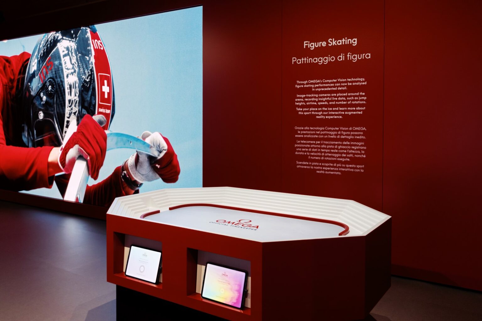 Non manca lo spettacolo del freestyle, con un’installazione dedicata al salto con gli sci: posizionandosi davanti a una fotocamera, un software basato su intelligenza artificiale genera un’immagine personalizzata che permette ai visitatori di immedesimarsi nei protagonisti degli sport estremi, creando un ricordo da condividere sui social. Per gli appassionati di pattinaggio di figura, un’area specifica illustra come oggi la tecnologia OMEGA raccolga dati avanzati su salti, tempi di volo, rotazioni e velocità di atterraggio, offrendo una lettura sempre più approfondita della performance atletica.