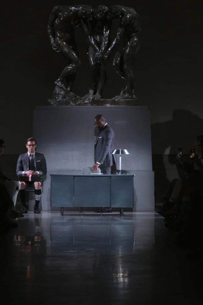 Sotto lo sguardo solenne delle sculture di Auguste Rodin, in particolare The Three Shades, la sfilata prende la forma di una narrazione sospesa tra disciplina e movimento. Ad aprire il percorso è una lunga camminata che conduce gli ospiti fino al museo, mentre la voce dell’attore Yahya Abdul-Mateen II accompagna lo show con letture evocative, trasformando la passerella in un’esperienza immersiva e quasi teatrale.