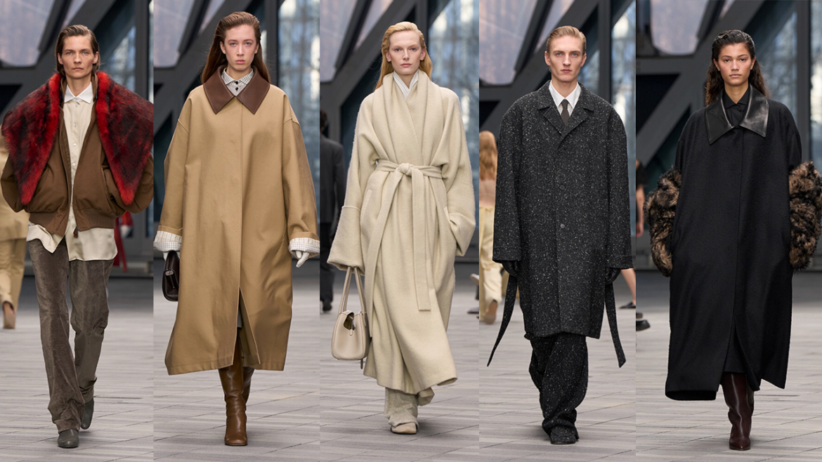 Tra i capi più incisivi emergono i cappotti, veri protagonisti della stagione. Revers triangolari enfatizzati, contrasti tattili tra lana compatta e shearling, tweed con inserti in pelle. Le proporzioni sono generose ma controllate: spalle ampie, volumi definiti, costruzione precisa. È un tailoring potente ma disciplinato, che suggerisce autorità senza ostentazione. Accanto a questa imponenza, compaiono momenti di estrema essenzialità, come tailleur pantalone in pelle beige ridotti a linee pure, dove il lusso coincide con la sottrazione.
