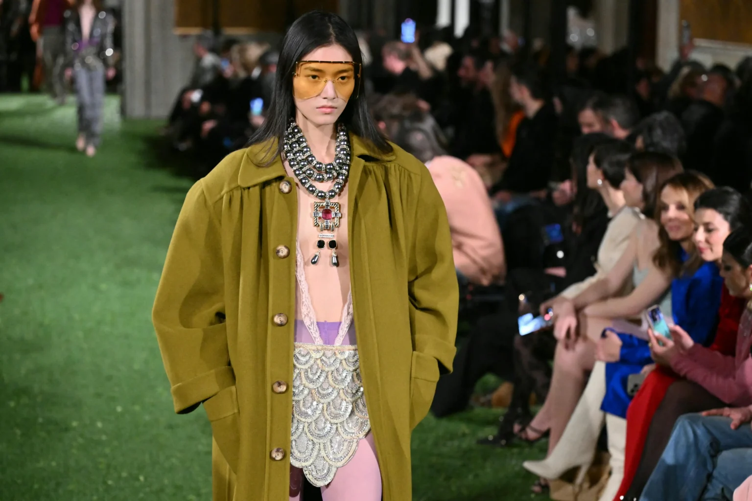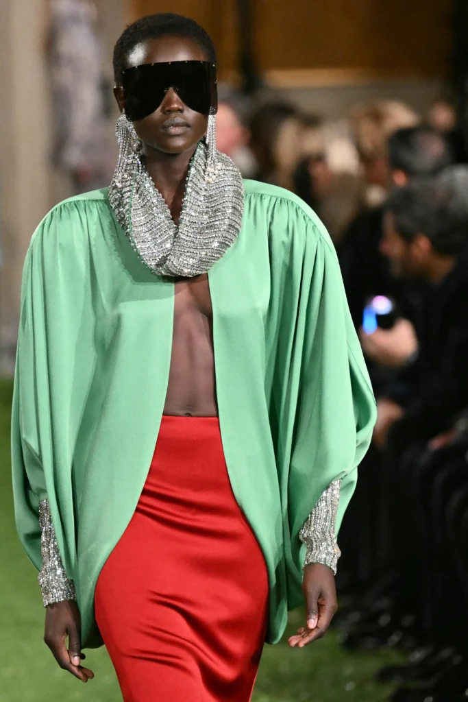 Anche gli accessori amplificano questa estetica stratificata. Collane scultoree, occhiali visiera oversize e pellicce trasformano il corpo in una sorta di architettura mobile, mentre gioielli importanti aggiungono un ulteriore livello narrativo ai look.