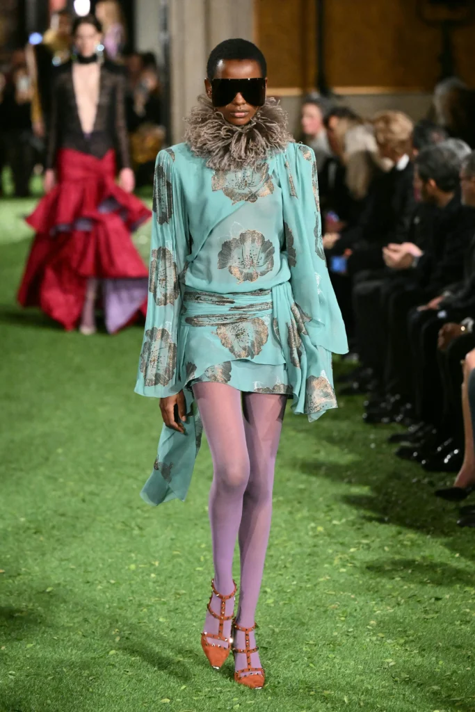 L’insieme costruisce una silhouette teatrale ma contemporanea, dove la couture si mescola a elementi più liberi e sperimentali. Le palette cromatiche contribuiscono a questo gioco di contrasti: al classico rosso Valentino si affiancano verde menta, lilla polverosi, sabbia e nero profondo, creando combinazioni cromatiche volutamente dissonanti.